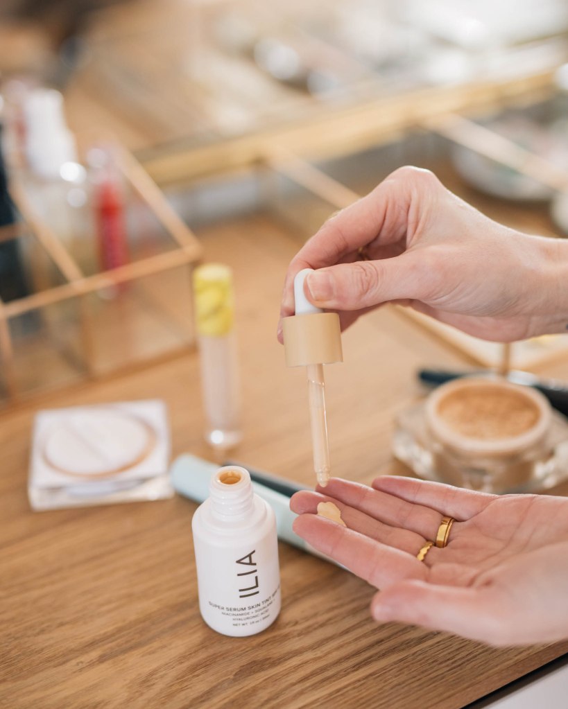 Of note, after you’ve applied you moisturizer and other skincare, I’m not sure how much this very very light skin tint is going to seep into the skin and penetrate through your skincare routine products. So I can’t attest to the active ingredients’ efficacy in skin tints. Rather, use a serum that adds hydration or illuminates. Also, sunscreen in makeup, including skin tints, is not enough to give you adequate protection. As a rule of thumb, apply sunscreen before makeup if you will have sun exposure of any sort, even just walking out your door.